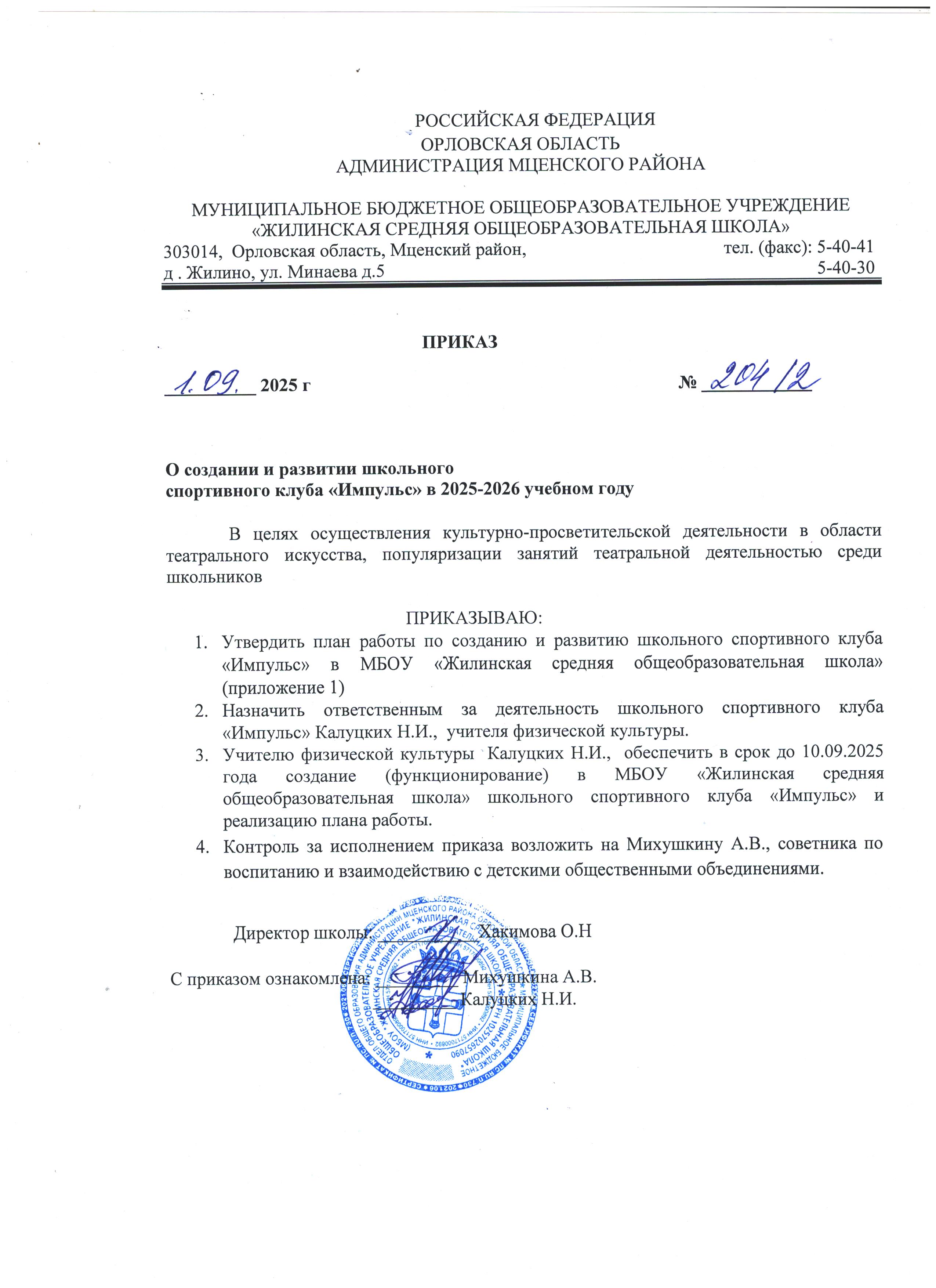 Приказ "О создании и развитии школьного спортивного клуба "Импульс" в 2025-2026 учебном году