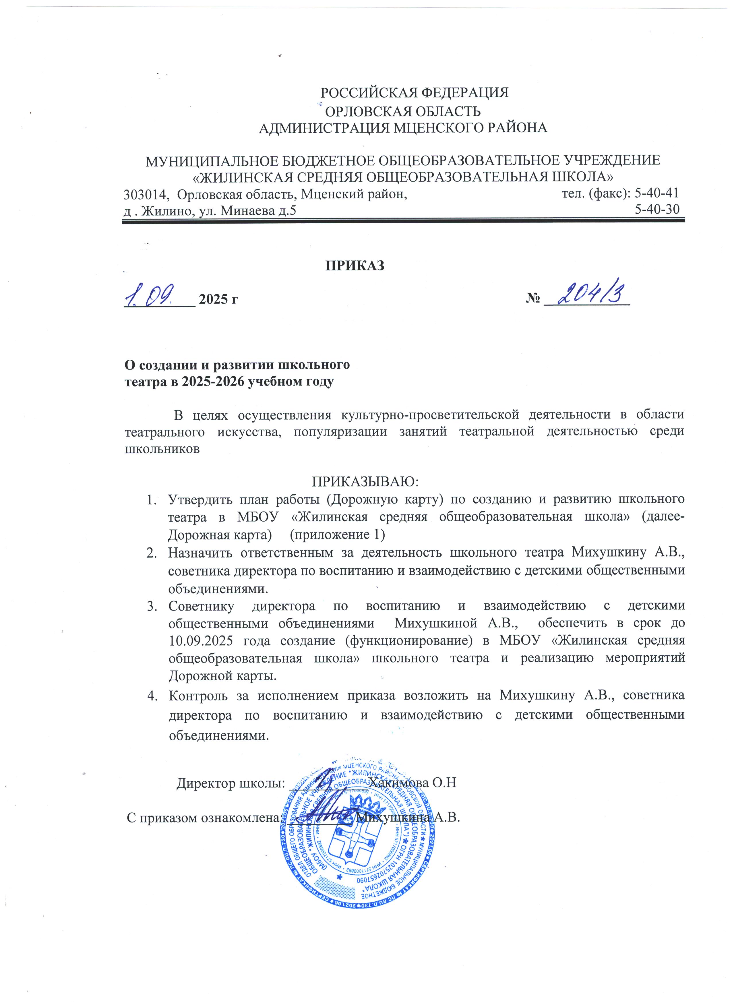 Приказ о создании и развитии школьного театра в 2025-2026 учебном году